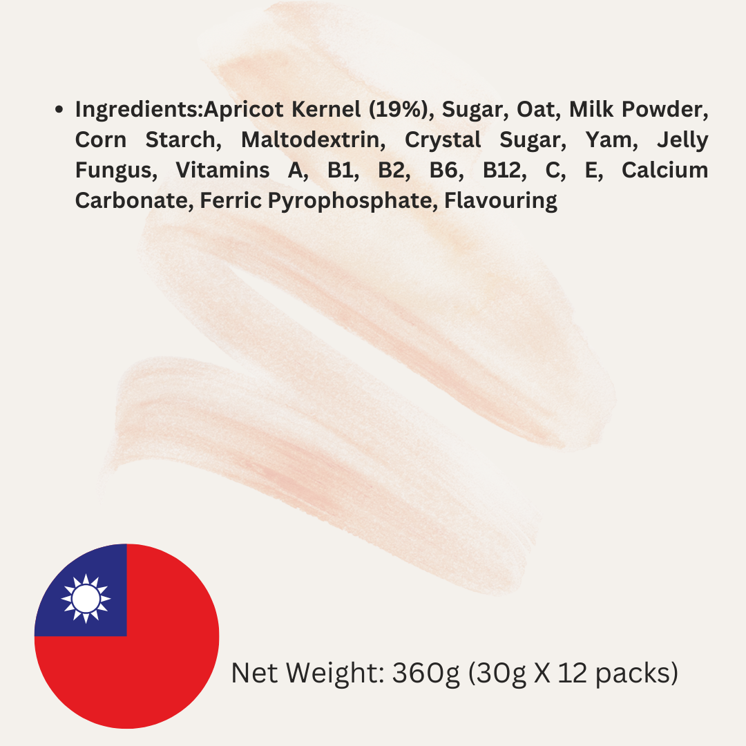 Ingredients:Apricot Kernel (19%), Sugar, Oat, Milk Powder, Corn Starch, Maltodextrin, Crystal Sugar, Yam, Jelly Fungus, Vitamins A, B1, B2, B6, B12, C, E, Calcium Carbonate, Ferric Pyrophosphate, Flavouring