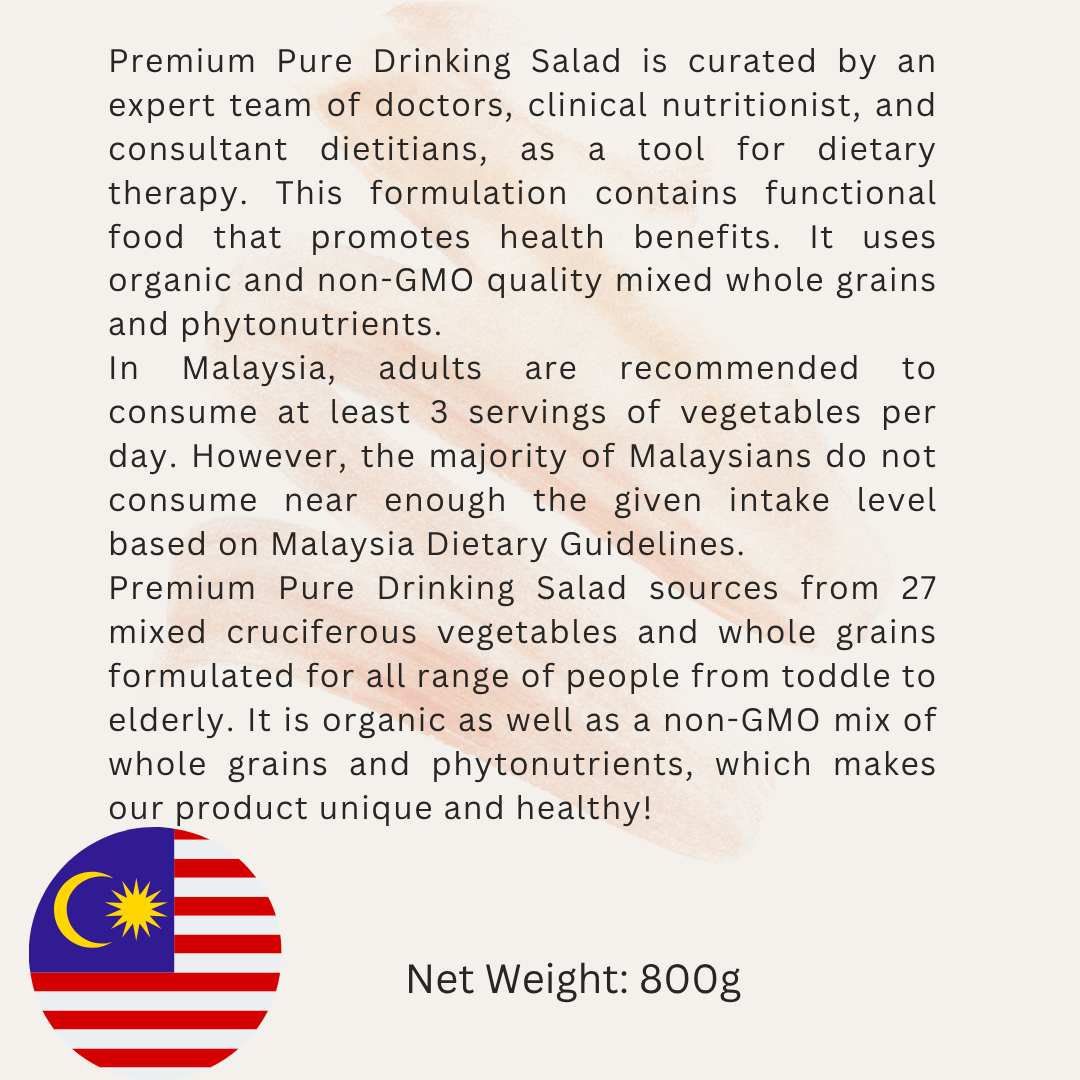 Premium Pure Drinking Salad sources from 27 mixed cruciferous vegetables and whole grains formulated for all range of people from toddle to elderly. It is organic as well as a non-GMO mix of whole grains and phytonutrients, which makes our product unique and healthy!